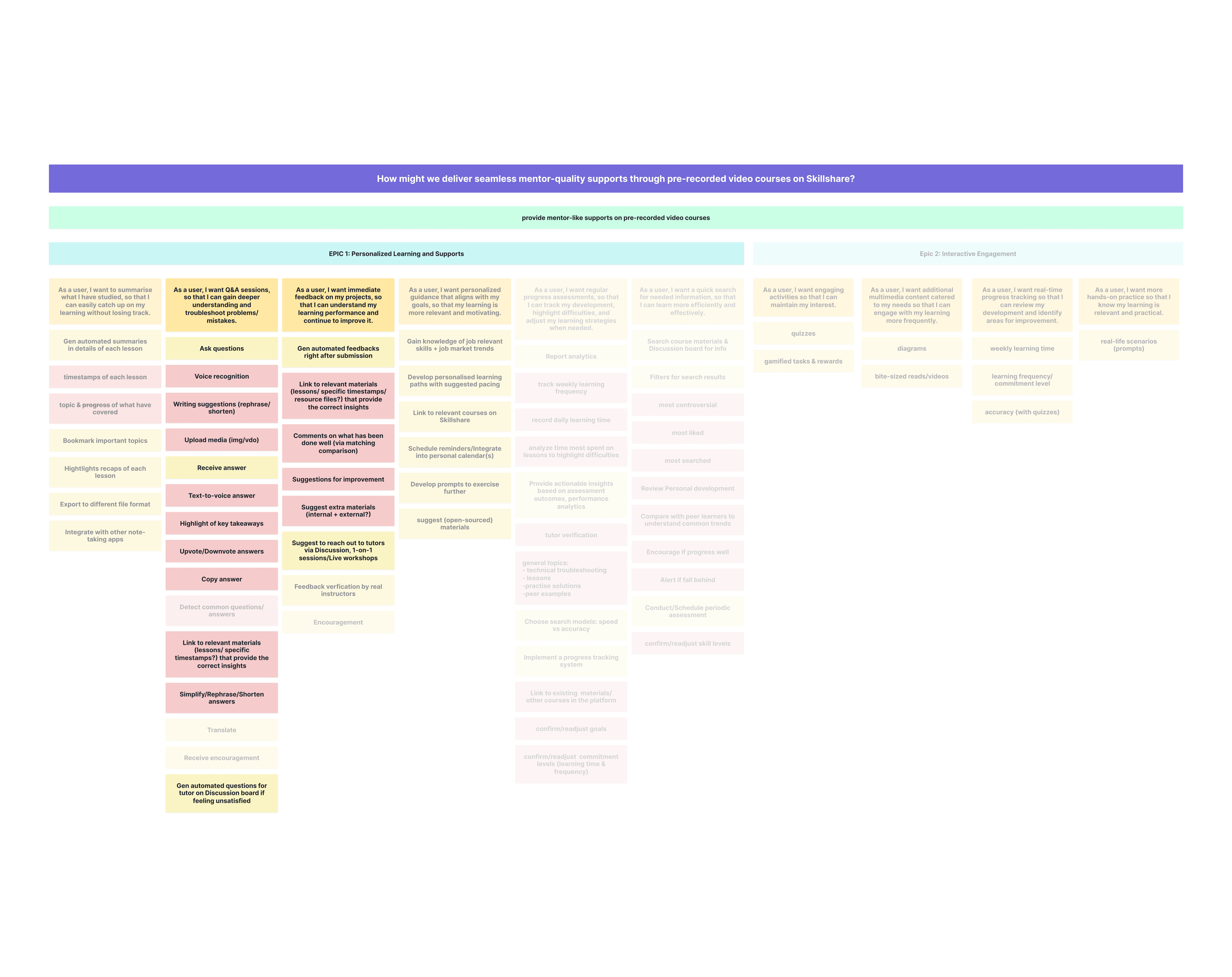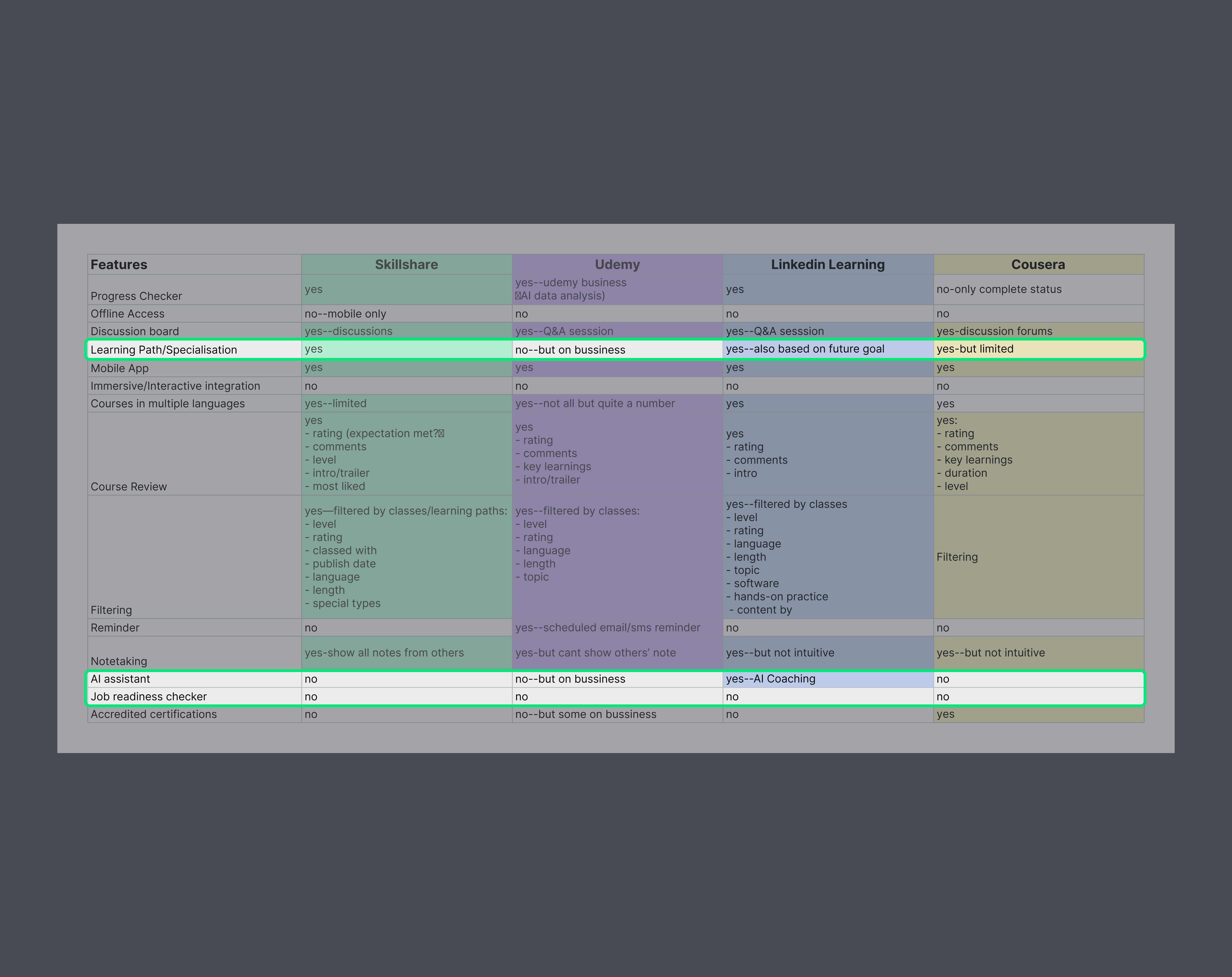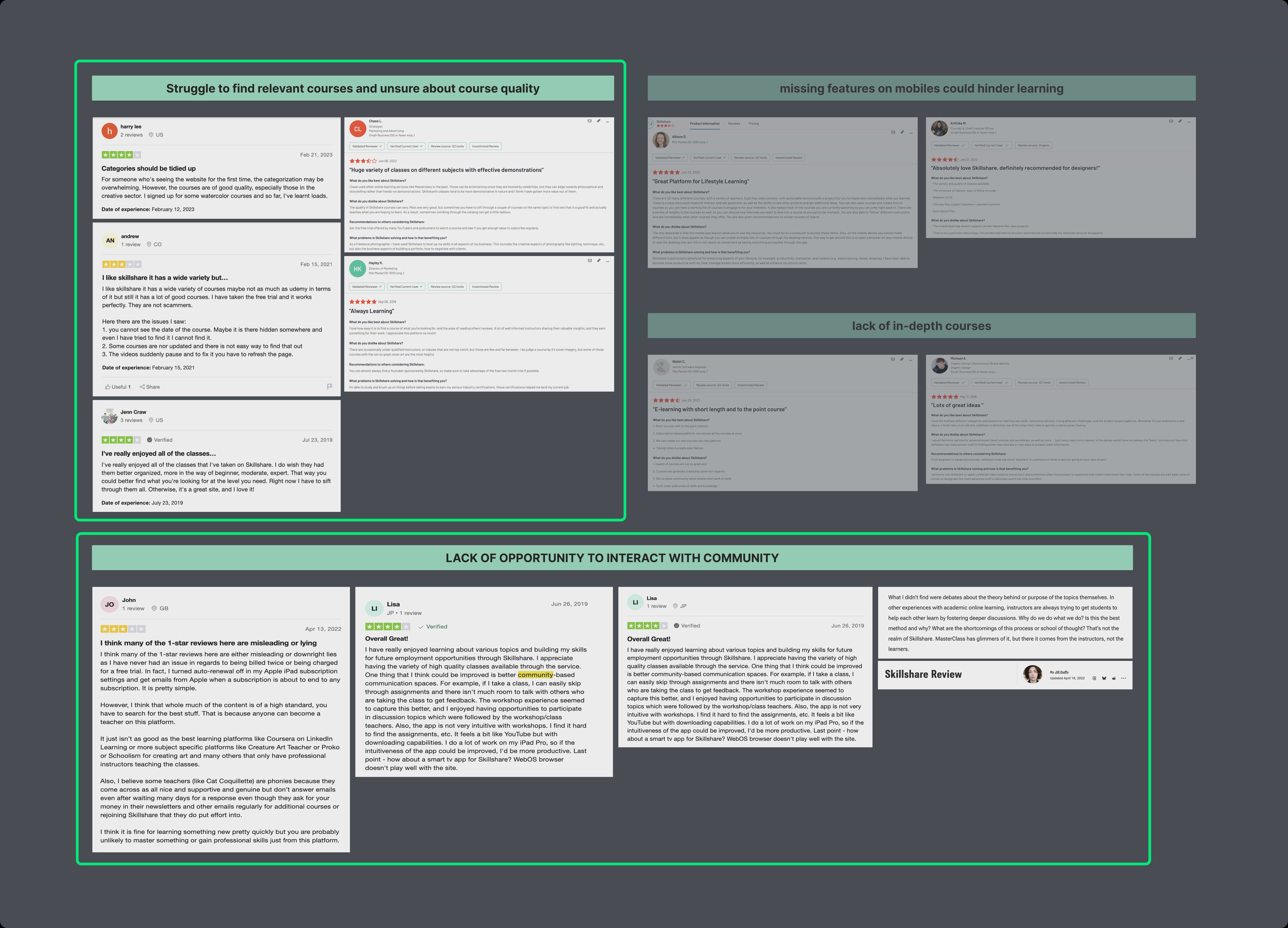 I interviewed 8 non-Skillshare users (from Udemy, LinkedIn Learning, and Coursera) to better understand their frustrations around their chosens platforms, validate my assumptions, and uncover their true needs.