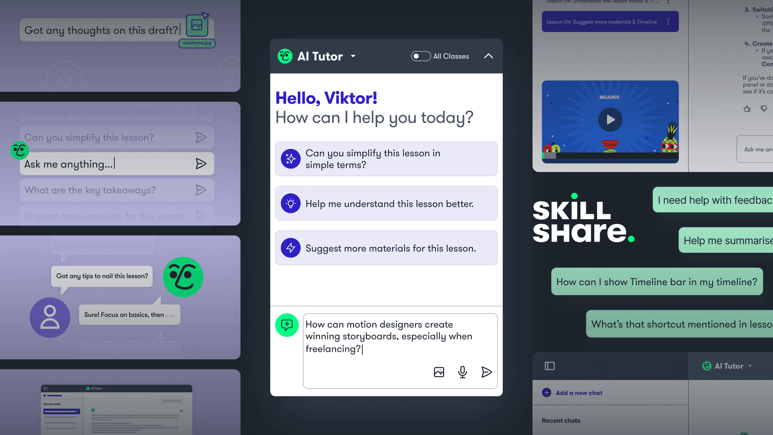 Get answers directly from Skillshare's database to resolve doubts without rewatching or searching elsewhere, plus suggested questions for community discussion.